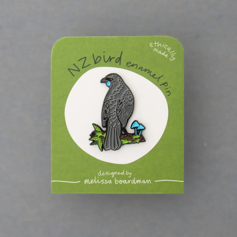 This enamel pin is inspired one of our most treasured, rare birds, the North Island kōkako. The pin features a kōkako perched on a mossy log and some werewere-kōkako (native blue mushrooms).