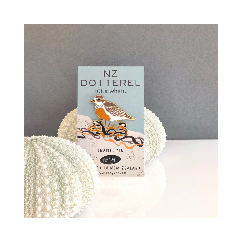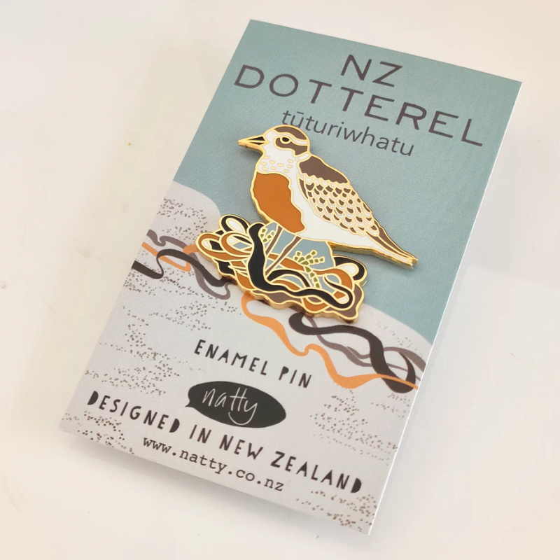 The endangered NZ Dotterel/ Tuturiwhatu shorebird in Hard Enamel designed by Natty.