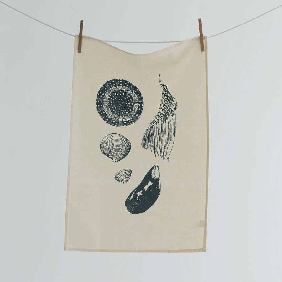 100 % natural (unbleached) ethically sourced cotton tea towel hand screen printed with our own hand drawn NZ Sea life design with a subtle image of NZ in the mussel shell.